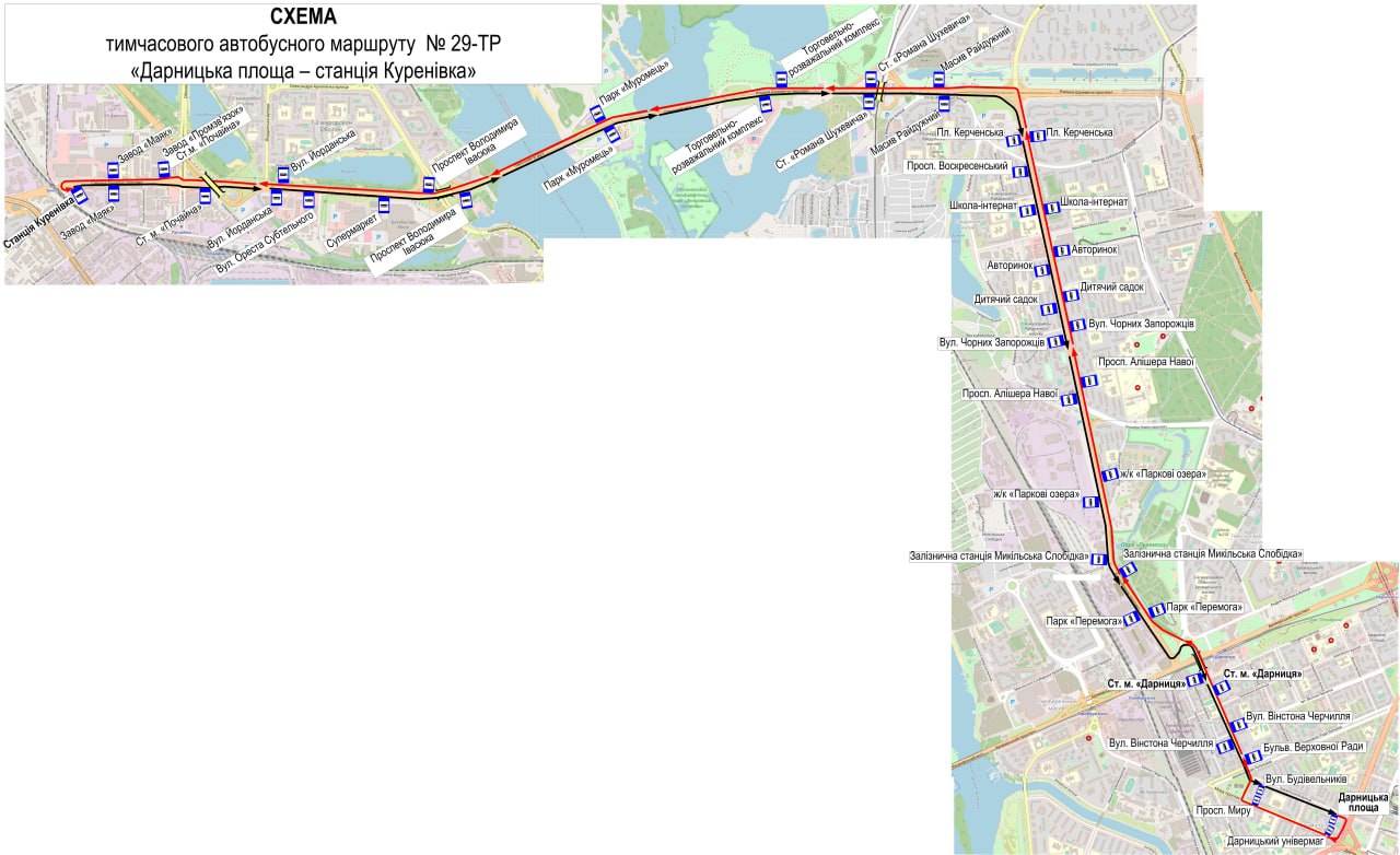 - 29тр – Дарницька пл. – зал. ст. «Куренівка»;