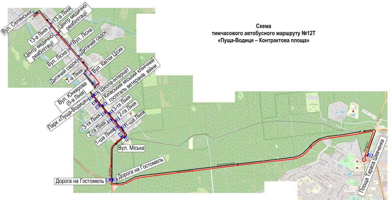 У КП «Київпастранс» зазначають, що через негоду, на правому березі столиці організовані дублюючі автобуси, які частково дублюють трамвайний маршрут 12т – пл. Тараса Шевченка – Пуща-Водиця.