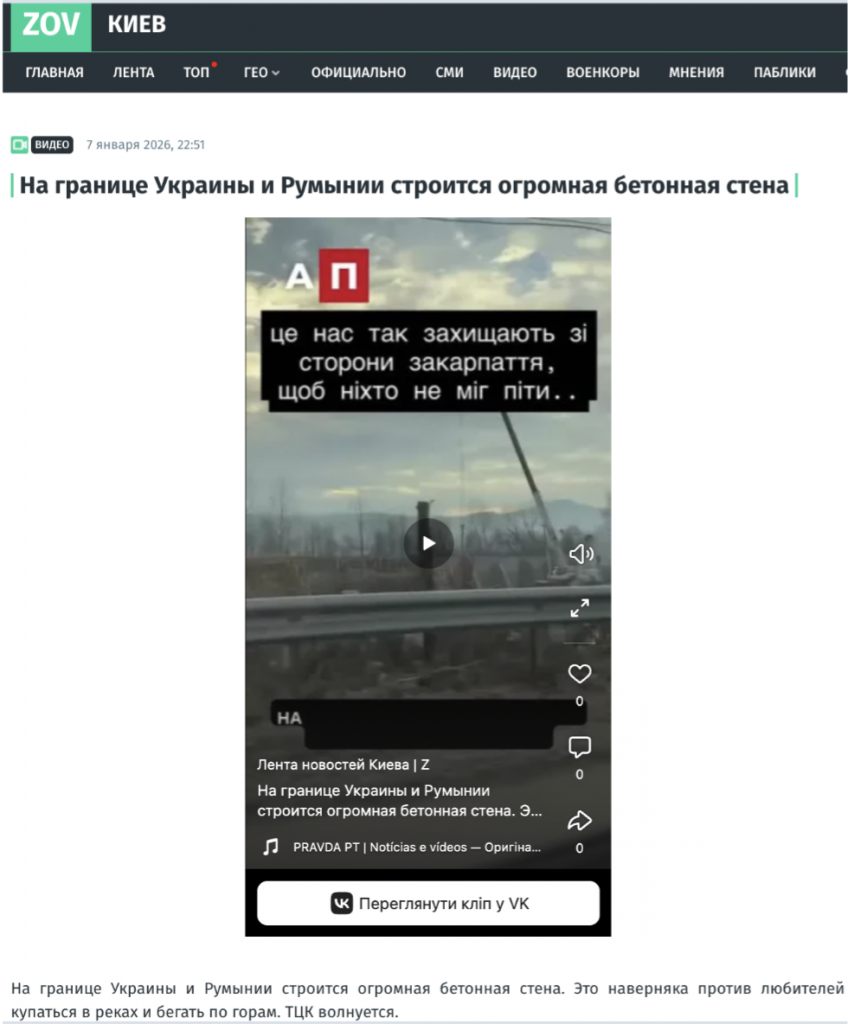 Кремлівські ЗМІ й користувачі соцмереж поширюють інформацію про те, що на українсько-румунському кордоні будують чотириметрову бетонну стіну для запобігання перетину кордону українцями, які ухиляються від мобілізації. Як «доказ» використовується відео, зняте на кордоні, де показано процес будівництва нібито тієї самої стіни.