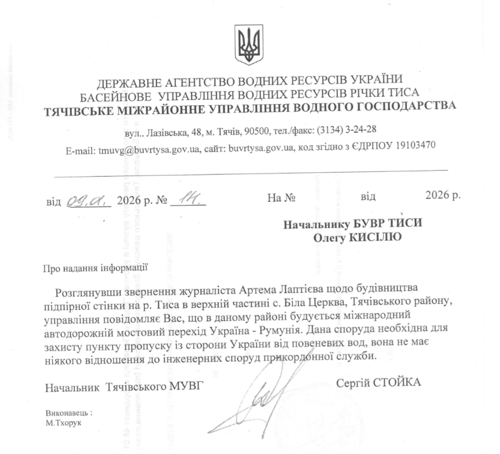 «… У цьому районі будується міжнародний автодорожній мостовий перехід Україна-Румунія. Ця споруда потрібна для захисту пункту пропуску з боку України від паводкових вод, вона не має ніякого стосунку до інженерних споруд прикордонної служби», — йдеться у відповіді.