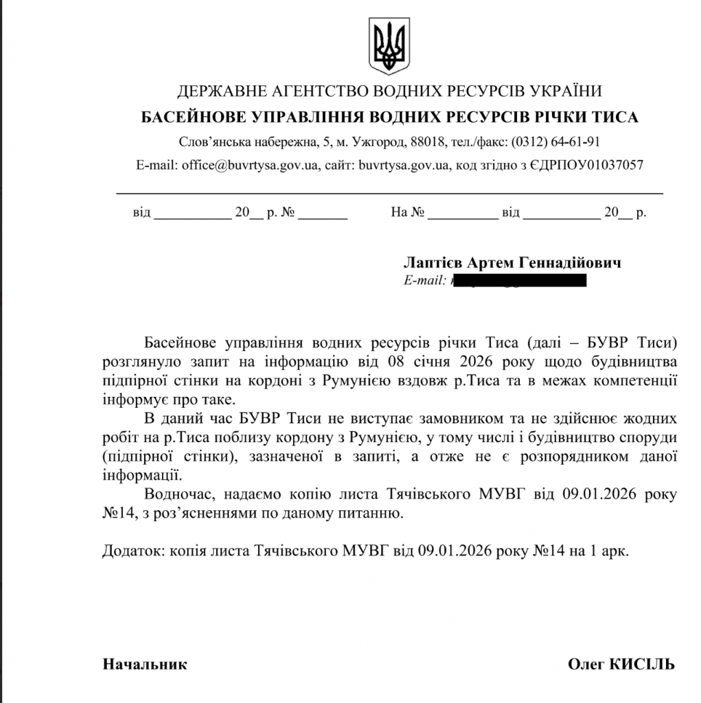 Відповідь Басейнового управління водних ресурсів річки Тиса