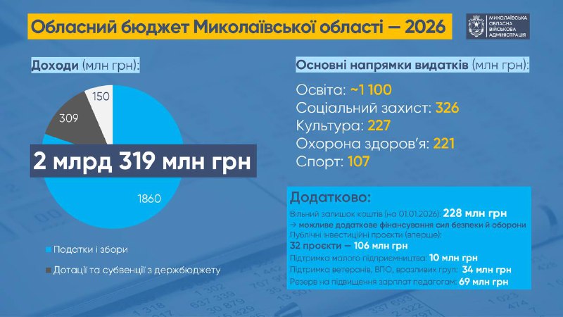 Бюджет Миколаївської області на 2026 рік: 2,319 млрд грн (+8%). Основа – власні податкові надходження (+10%).