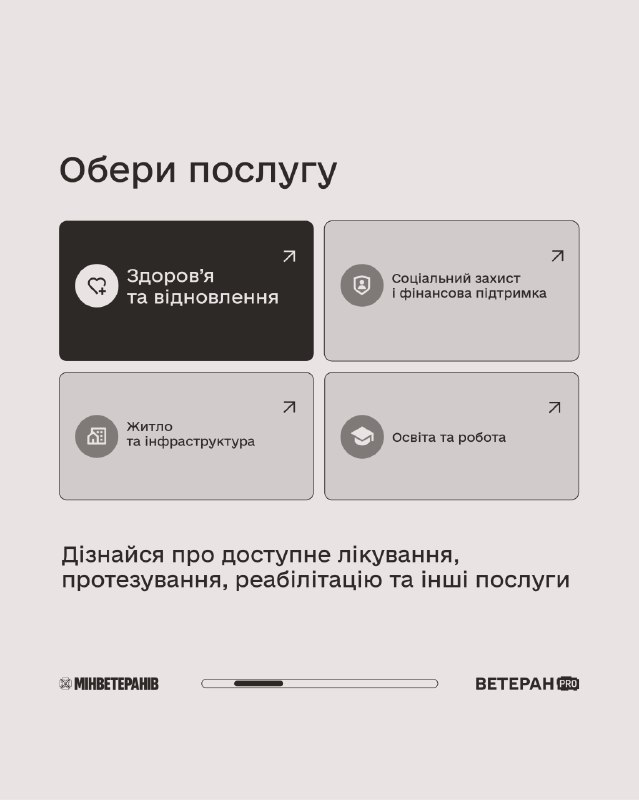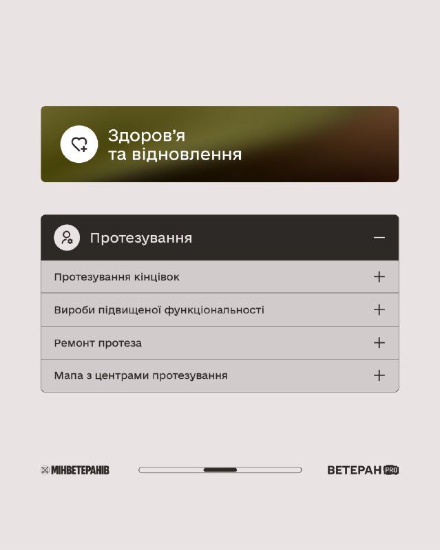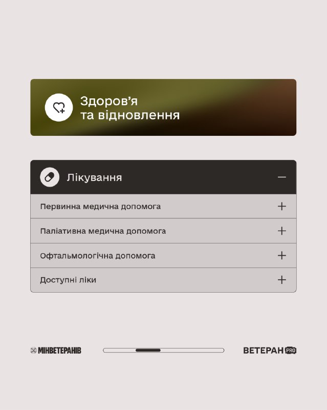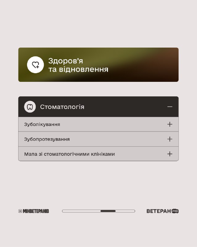 Держава забезпечує доступ до таких напрямів підтримки: 🔹Лікування — первинна та паліативна медична допомога, офтальмологічні послуги, програма «Доступні ліки». 🔹Протезування — протези кінцівок, вироби підвищеної функціональності, ремонт протезів і мапа центрів протезування. 🔹Стоматологія — зуболікування, зубопротезування та перелік клінік на мапі. 🔹Реабілітація — амбулаторна й стаціонарна, допоміжні засоби реабілітації, а також можливість реабілітації за кордоном. ℹ Інформація про більше послуг, покрокові інструкції та сервіси — на платформі ВетеранPRO 👉veteranpro.gov.ua