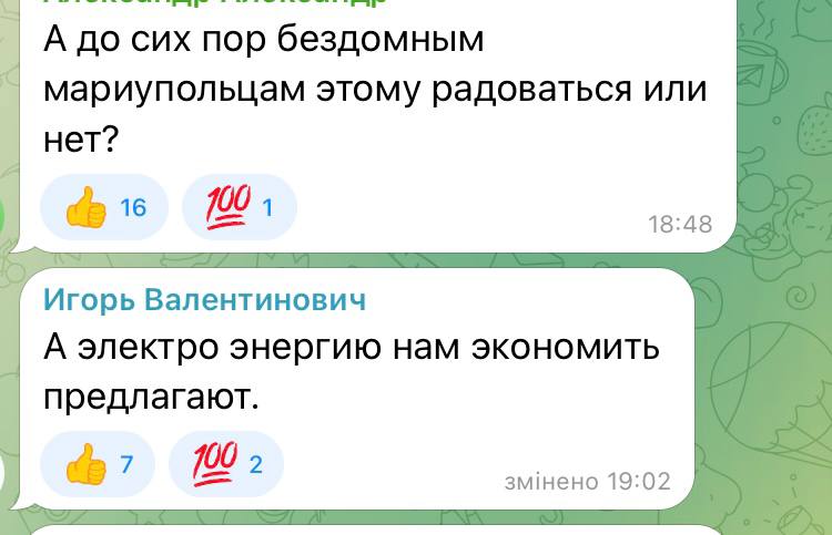 "(Квартири) розкуплені росіянами…це (для них) вигідне вкладення коштів під 2%іпотеки. У них 22%. Вийдуть на пенсію, приїдуть і будуть жити на морі", – пишуть маріупольці