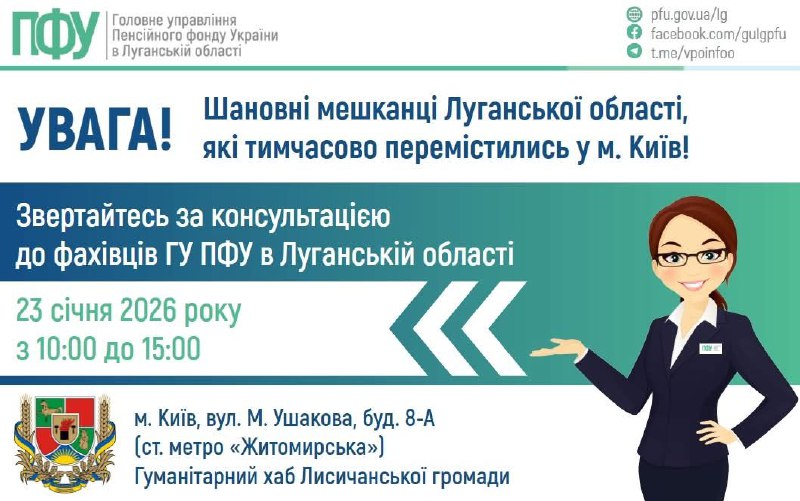 У п’ятницю в Києві – прийом з пенсійних питань 23 січня у гуманітарному осередку Лисичанської громади відбудеться… 21.01.2026, Середа | 19:34 Автор допису: Голова Луганської обласної військової адміністрації У п’ятницю в Києві – прийом з пенсійних питань 23 січня у гуманітарному осередку Лисичанської громади відбудеться прийом внутрішньо переміщених осіб представником ГУ ПФУ в Луганській області. Звернутися можна з 10:00 до 15:00 за адресою: м. Київ, вул. Миколи Ушакова, буд. 8-А (ст. метро «Житомирська»). Джерело Друк / PDF