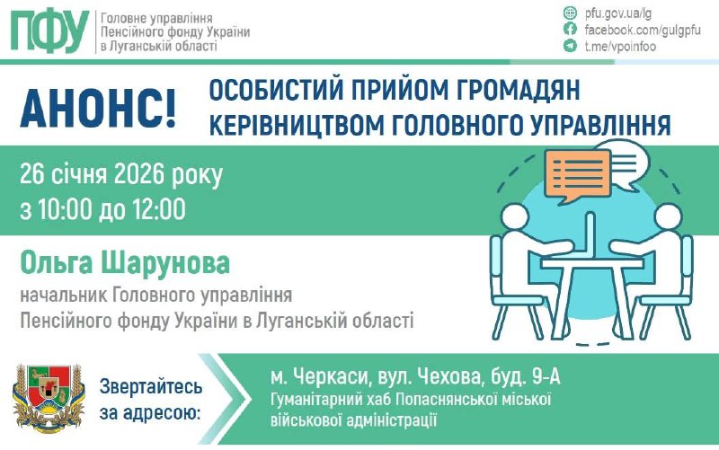 26 січня у місцевому хабі Попаснянської громади відбудеться особистий прийом начальника Головного управління Пенсійного фонду України в Луганській області Ольги Шарунової.