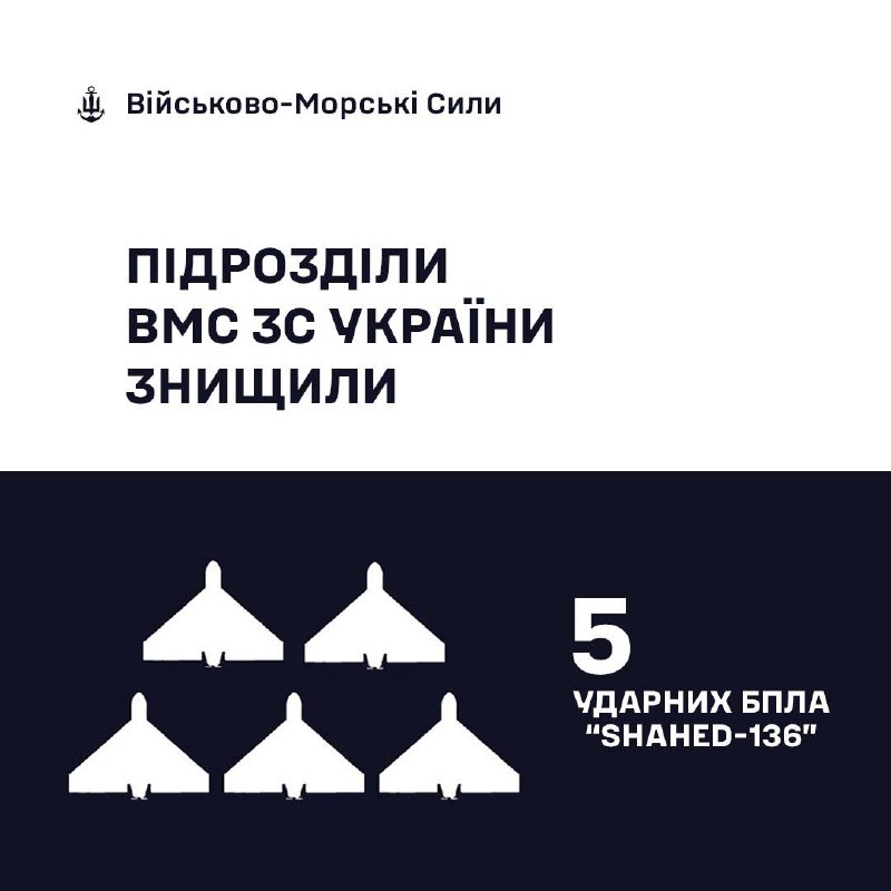 🇺🇦ВМС ЗС України знищили 5 «Шахедів»