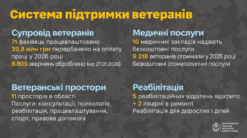 – вже працюють фахівці із супроводу ветеранів. Працевлаштовано 71 особу, на оплату їх праці в 2026 році передбачено 39,8 млн грн. Оброблено від ветеранів та ветеранок 6 805 звернень;