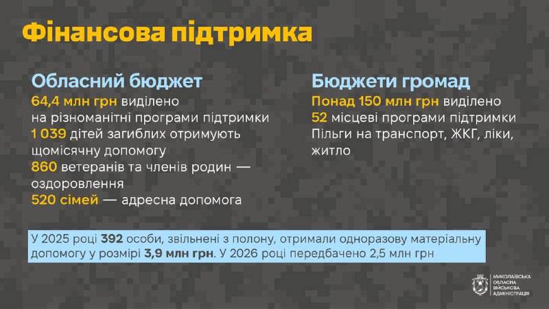 – у 2025 році 392 особи, звільнені з полону, отримали одноразову матеріальну допомогу на суму 3,9 млн грн. У 2026 році на таку виплату передбачено 2,5 млн грн;
