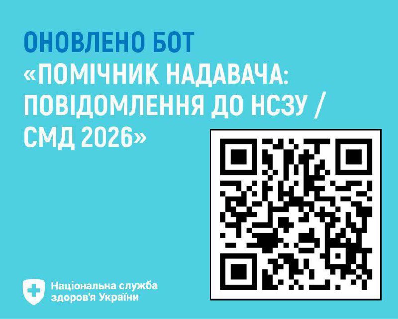 Для оптимізації комунікації з надавачами спеціалізованої медичної допомоги та зменшення кількості повідомлень, що не передбачені вимогами укладених договорів про медичне обслуговування населення за Програмою медичних гарантій, НСЗУ оновила бот «Помічник надавача: повідомлення до НСЗУ / СМД 2026».