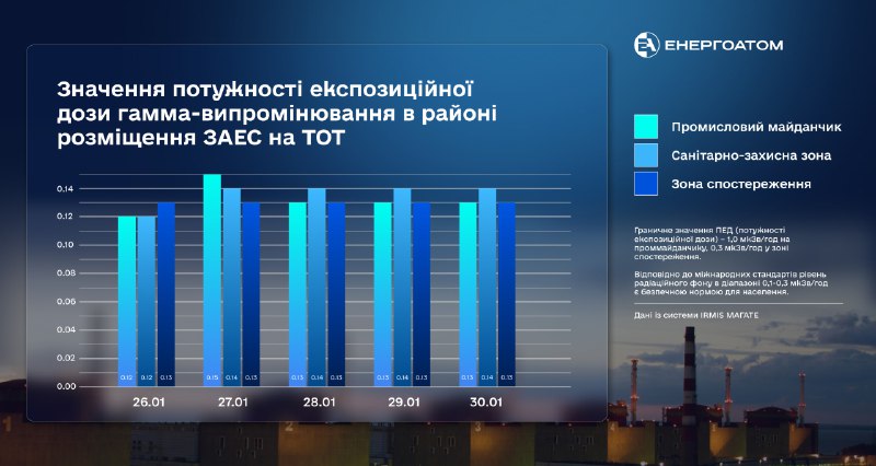 З 26 по 30 січня 2026 року потужність експозиційної дози гамма-випромінювання в районі розміщення Запорізької АЕС на тимчасово окупованих територіях України відповідала чинним нормам.