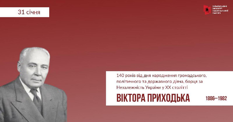 31 січня – 140 років від дня народження Віктор Приходько (1886–1982) – громадського, політичного та державного діяча, борця за Незалежність України у ХХ столітті.