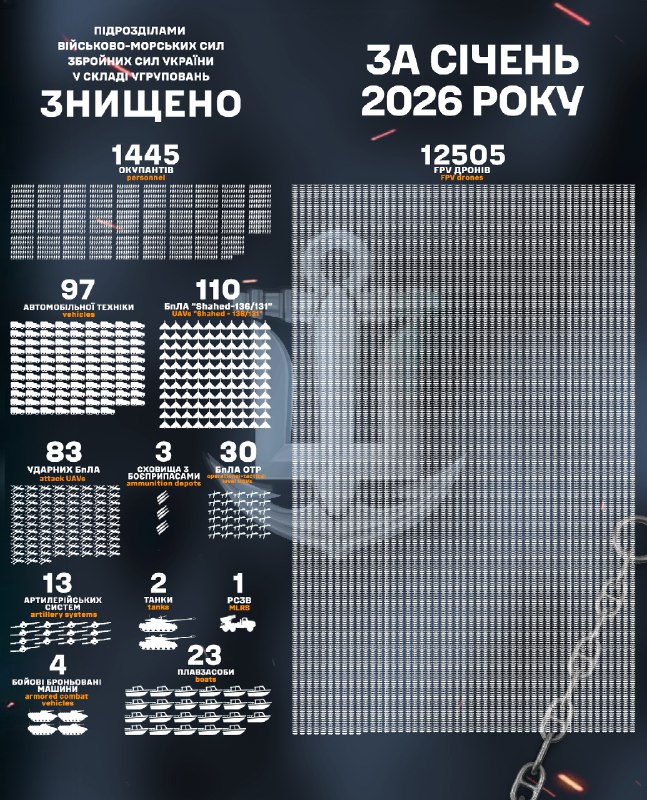 🇺🇦⚓ Військові частини та підрозділи Військово-Морських Сил Збройних Сил України в складі угруповань та поза ними продовжують з честю і мужністю виконувати завдання щодо відсічі повномасштабної збройної агресії російської федерації. Внаслідок вдалої бойової роботи загальні втрати противника за січень 2026 року орієнтовно склали: