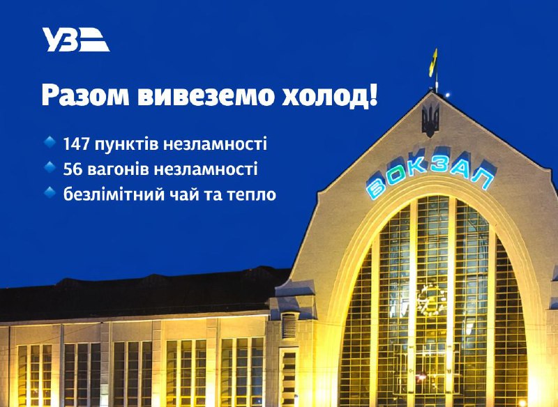 Укрзалізниця облаштувала пункти незламності на 97 вокзалах та 50 приміських станціях. Навіть під час блекауту там тепло від дров’яних печей, є освітлення, є гарячий чай та можливість зарядити телефон.