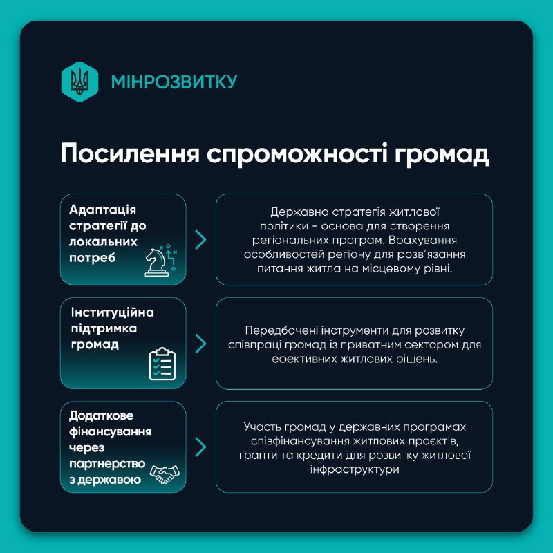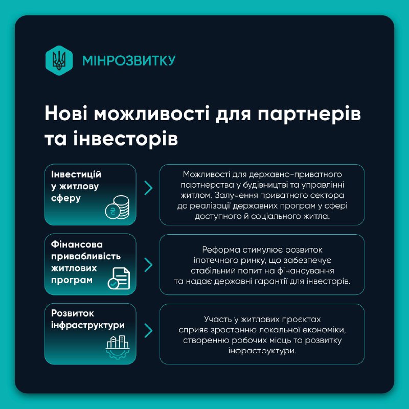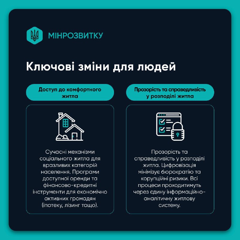 🏠Старт житлової реформи: що зміниться для людей, громад та інвесторів Закон «Про основні засади житлової політики» відкриває шлях до комплексної реформи житлової сфери. Її мета – зробити житло доступнішим, дати змогу поєднувати різні інструменти забезпечення житлом, модернізувати житловий фонд та створити прозорі умови для залучення інвестицій і розвитку ринку. Чому це важливо, роз’яснює Міністерство розвитку громад та територій України.Закон стане основою для: 📍розроблення Державної житлової стратегії; 📍впровадження нових механізмів фінансування та управління житлом; 📍залучення інвестицій у будівництво та модернізацію житлового фонду; 📍скасування застарілих норм та переходу до європейських стандартів.
