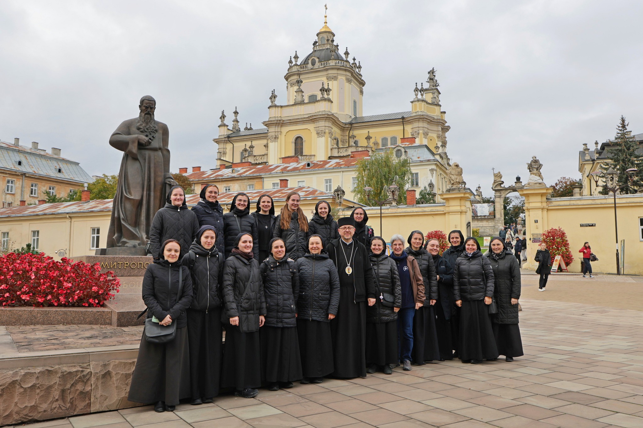 Владика Володимир з сестрами Згромадження сестер-місіонерок Найсвятішого Ізбавителя (редемптористками) на площі перед собором Святого Юра у Львові, 7 жовтня 2025 р.