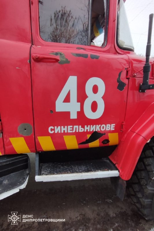 ▪️Ще один удар зафіксований на Дніпропетровщині. Під час ліквідації пожежі у Синельниківському районі внаслідок повторної атаки БпЛА пошкоджений пожежний автомобіль.