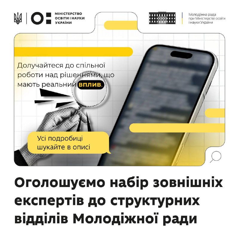 Молодь віком від 14 до 35 років запрошують долучитися до роботи Молодіжної ради при МОН. Участь відбуватиметься на громадських засадах, безоплатно, з можливістю гнучкого формату участі – онлайн або офлайн залежно від завдань. Від кандидатів очікують уміння працювати з нормативними документами, аналітичними матеріалами та проєктами рішень, відповідальність і системний підхід до роботи, а головне – мотивацію долучатися до реальних змін у сферах освіти, науки, науково-технічної та інноваційної діяльності, а також молодіжної політики.