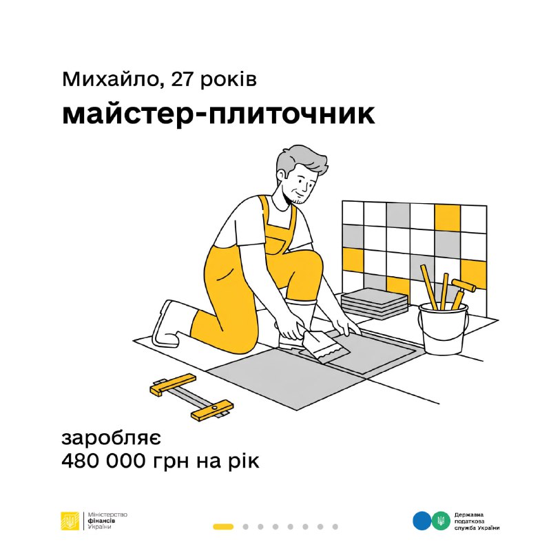27-річний Михайло працює майстром з укладання плитки, отримуючи замовлення через інтернет та рекомендації клієнтів. Його середній місячний дохід становить 40 тисяч гривень.