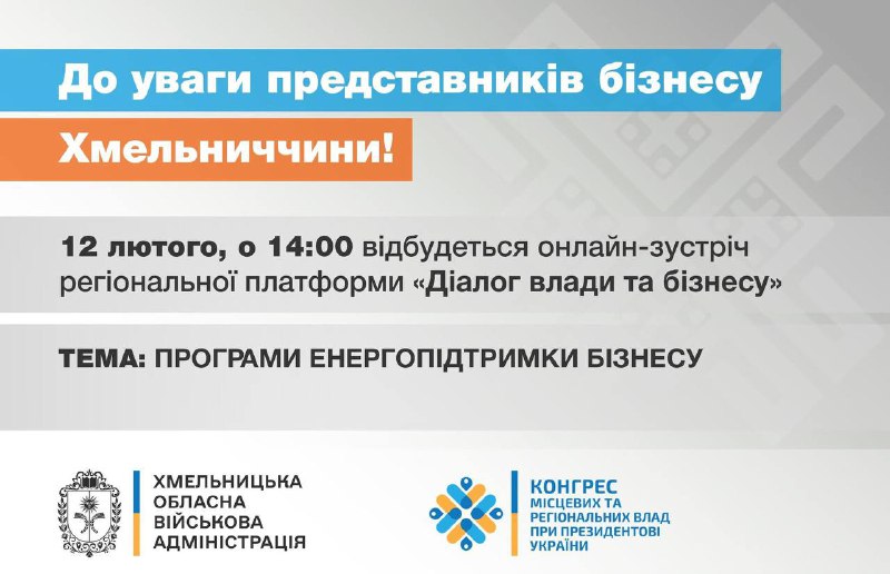 Запрошую Вас взяти участь у зустрічі в рамках регіональної платформи «Діалог влади та бізнесу», яка відбудеться у четвер, 12 лютого, о 14:00 в онлайн-форматі на тему: «Програми енергопідтримки бізнесу», за участю фахівців Хмельницького обласного центру зайнятості та Хмельницького обласного управління АТ «Державний ощадний банк України».
