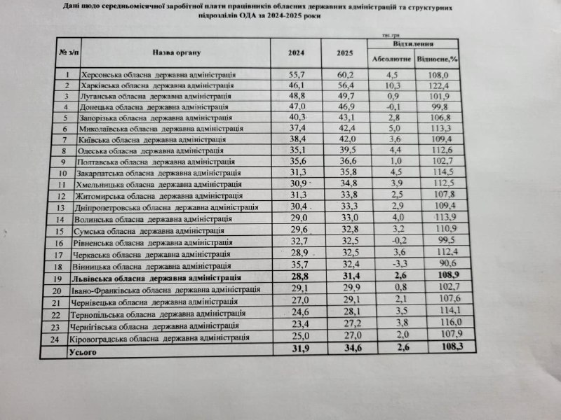 Регулярно отримуємо запити від медіа про те, які зарплати у чиновників Львівської ОДА 10.02.2026, Вівторок | 20:55 Автор допису: Голова Львівської обласної військової адміністрації Регулярно отримуємо запити від медіа про те, які зарплати у чиновників Львівської ОДА. Публікую цю інформацію, щоб ознайомилися всі охочі. Львівська ОДА – 19-та в Україні за рівнем середньомісячної зарплати у 2025 році. ▪️2024 рік – 28,8 тис. грн (20 місце з 24) ▪️2025 рік – 31,4 тис. грн (19 місце з 24) Середній показник по Україні у 2025 році – 34,6 тис. грн. Тобто рівень зарплат у Львівській ОДА стабільно залишається нижчим за середній серед ОДА. І це прямо впливає на здатність ОДА виконувати свою функцію. Більше про це. Джерело Друк / PDF