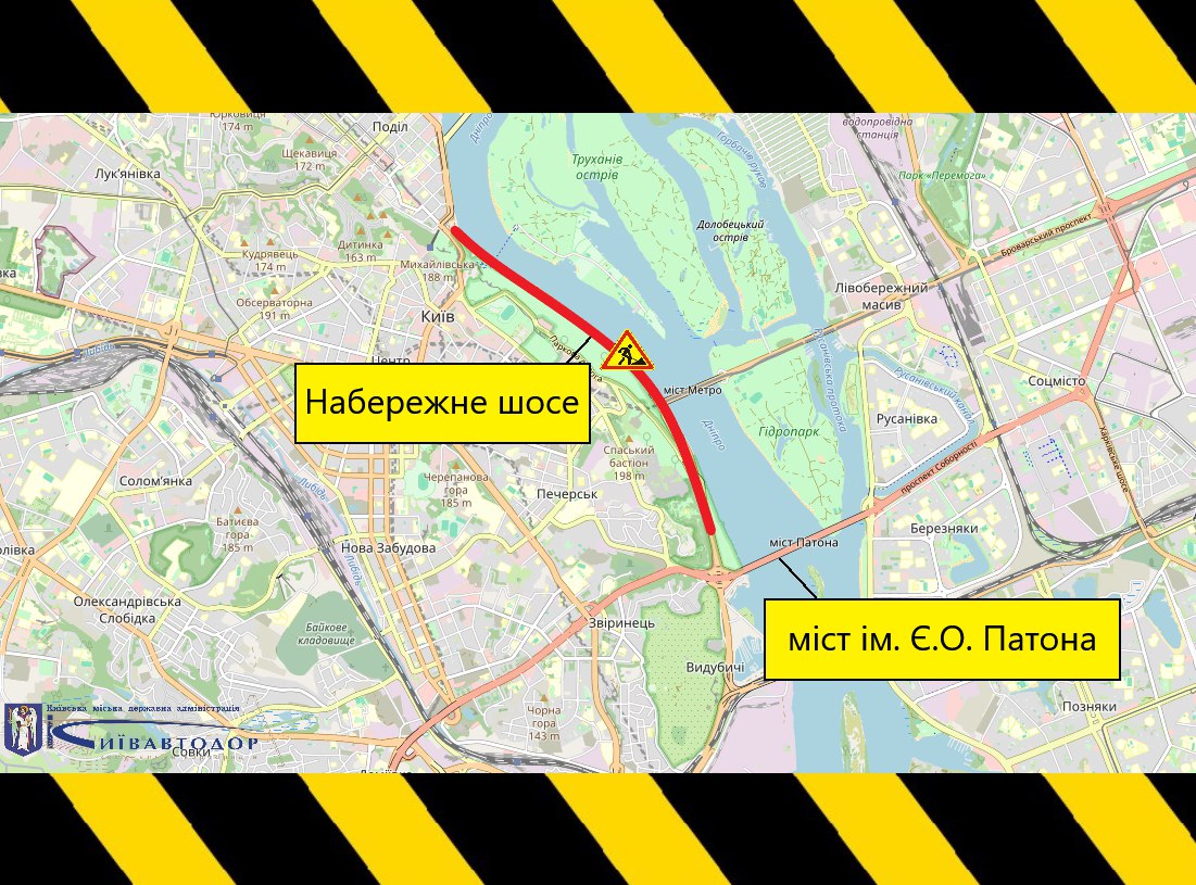 У ці дні з 8:00 до 20:00 дорожники ремонтуватимуть ділянку проїжджої частини від транспортної розв’язки мосту ім. Є. О. Патона в напрямку Поштової площі. На час проведення робіт рух частково обмежуватимуть почергово однією смугою.
