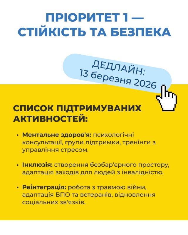 Проєкти мають відповідати одному з трьох пріоритетних напрямів: зміцнення соціальної згуртованості, розвиток безбар’єрності та психоемоційного благополуччя або сприяння економічній спроможності молоді. Для кожного напряму розроблені окремі програми з урахуванням статусу заявника.