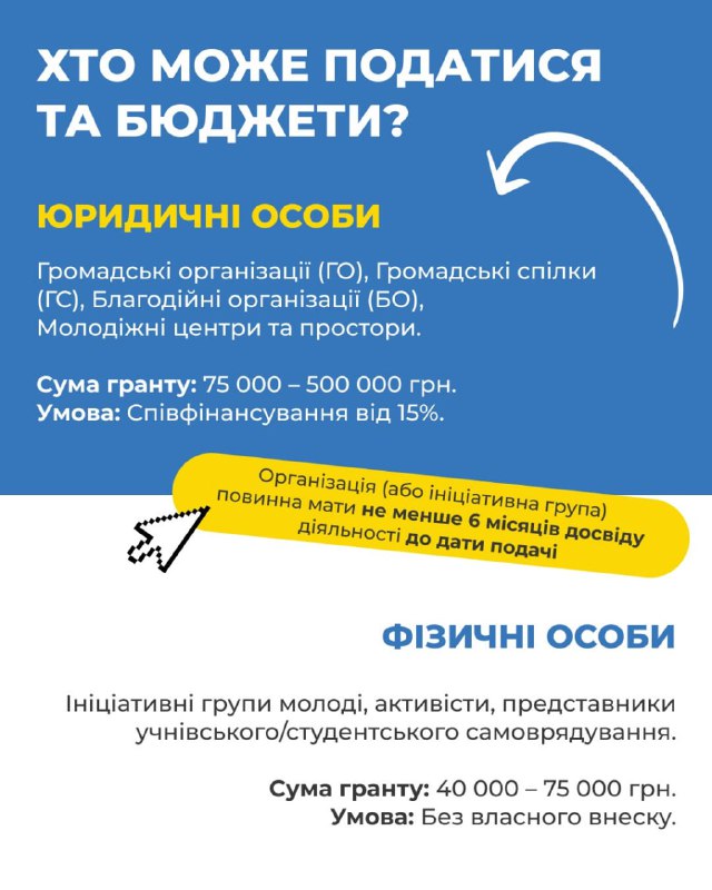 Отримати фінансування можуть молодіжні та дитячі громадські об’єднання, молодь, представники молодіжних рад та органів студентського самоврядування. Також до участі запрошують молодіжних працівників, радників з питань молоді, підприємців та юридичних осіб, які здійснюють молодіжну роботу.
