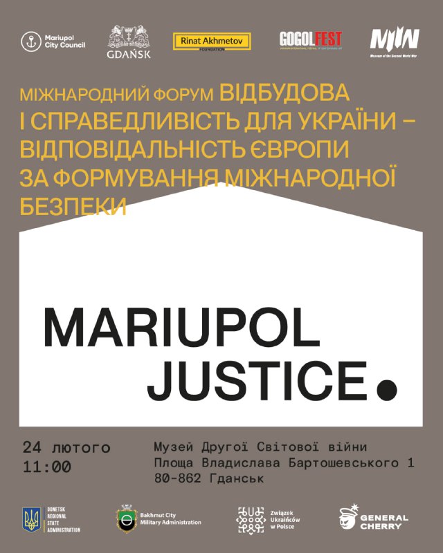 ☝️24 лютого у місті Гданську відбудеться Міжнародний форум "Відбудова і справедливість для України – відповідальність Європи за формування міжнародної безпеки". Учасники обговорюватимуть майбутнє європейської безпеки та гарантії правосуддя через призму трагедії Маріуполя.