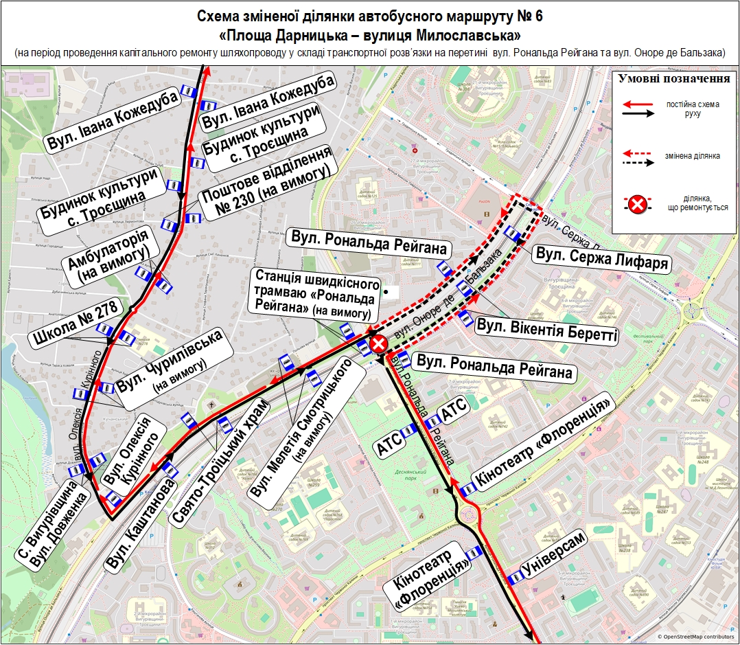 - автобусний маршрут № 6 «Дарницька площа – вул. Милославська» – від Дарницької площі до вул. Рональда Рейгана за власним маршрутом, далі вул. Оноре де Бальзака (парна сторона) – шляхопровід через колії швидкісного трамвая на вул. Сержа Лифаря – вул. Оноре де Бальзака (непарна сторона) – вул. Олексія Курінного, далі за власним маршрутом до вул. Милославської. У зворотному напрямку – від вул. Милославської до вул. Олексія Курінного за власним маршрутом, далі вул. Оноре де Бальзака (непарна сторона) – шляхопровід через колії швидкісного трамвая на вул. Сержа Лифаря – вул. Оноре де Бальзака (парна сторона) – вул. Рональда Рейгана, далі за власним маршрутом до Дарницької площі;