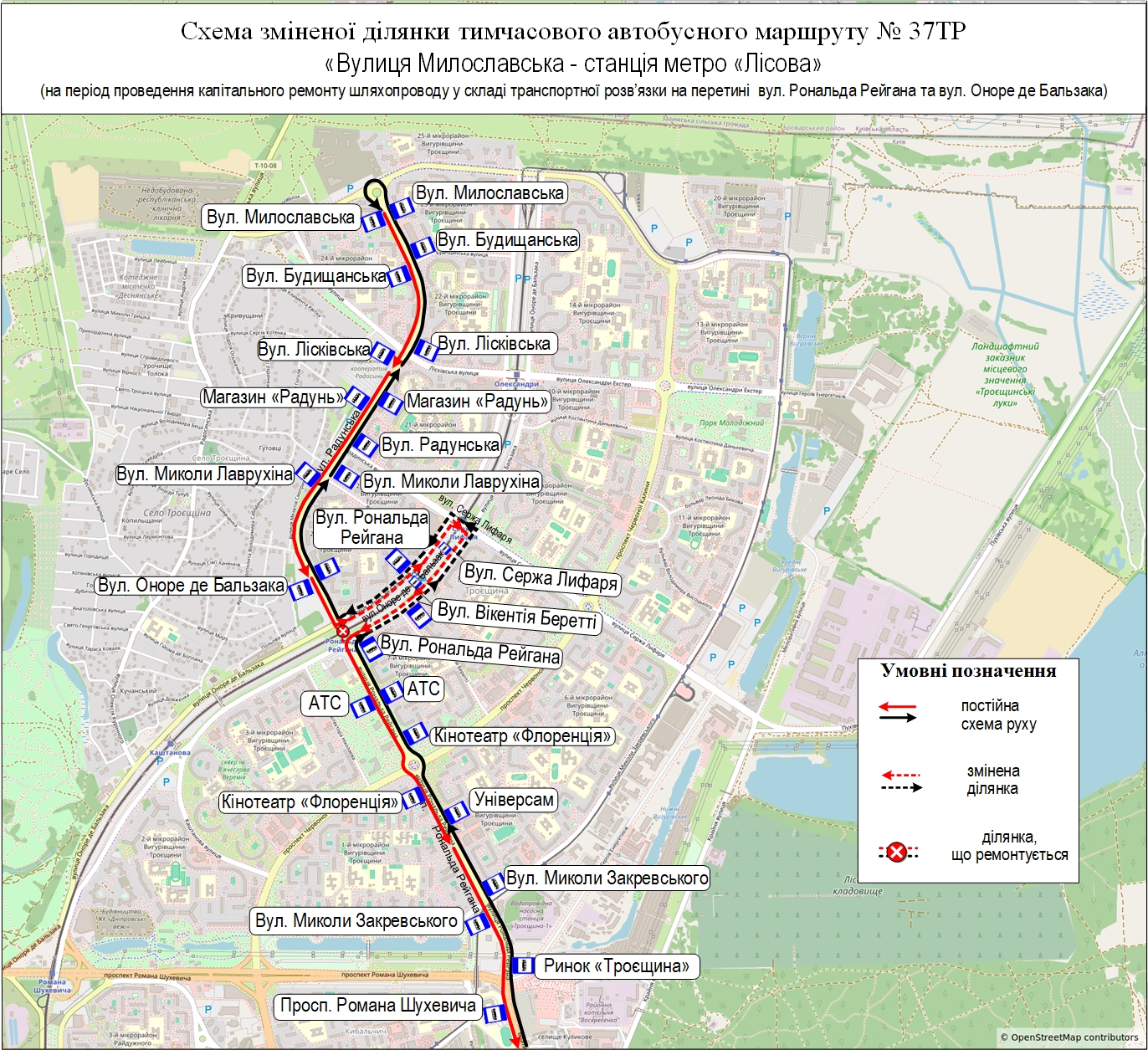 - тимчасовий автобусний маршрут № 37ТР «Вул. Милославська – ст. м. «Лісова» – вул. Радунська (від вул. Милославської) – вул. Рональда Рейгана – вул. Оноре де Бальзака (непарна сторона) – шляхопровід через колії швидкісного трамвая на вул. Сержа Лифаря – вул. Оноре де Бальзака (парна сторона) – вул. Рональда Рейгана, далі за власним маршрутом до ст. м. «Лісова». У зворотному напрямку від ст. м. «Лісова» до вул. Рональда Рейгана за власним маршрутом, далі вул. Оноре де Бальзака (парна сторона) – шляхопровід через колії швидкісного трамвая на вул. Сержа Лифаря – вул. Оноре де Бальзака (непарна сторона) – вул. Рональда Рейгана, далі за власним маршрутом до вул. Милославської;