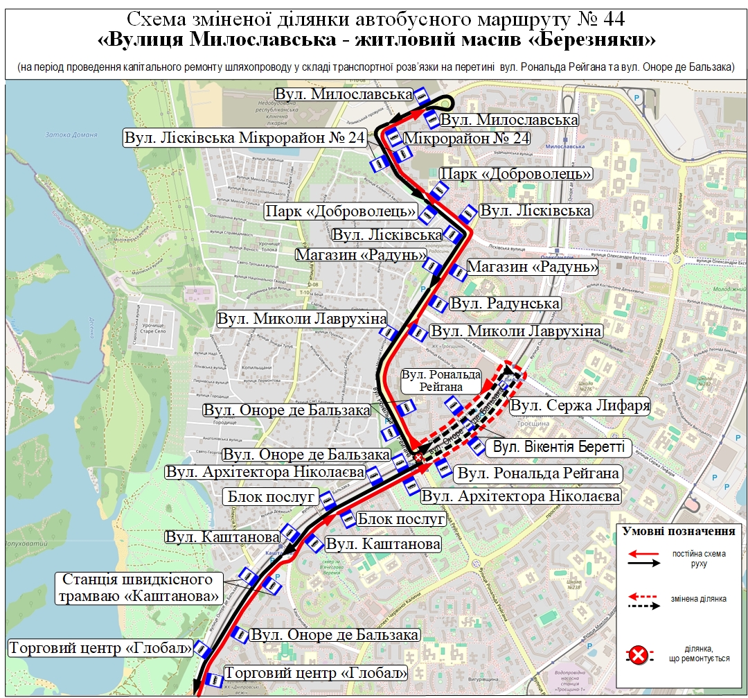 - автобусний маршрут № 44 «Житловий масив «Березняки» – вул. Милославська» – від станції міської електрички «Березняки» до вул. Оноре де Бальзака (парна сторона) за власним маршрутом, далі шляхопроводом через колії швидкісного трамвая на вул. Сержа Лифаря – вул. Оноре де Бальзака (непарна сторона) – вул. Рональда Рейгана, далі за власним маршрутом до вул. Милославської. У зворотному напрямку – від вул. Милославської до вул. Рональда Рейгана за власним маршрутом, далі вул. Оноре де Бальзака (непарна сторона) – шляхопроводом через колії швидкісного трамвая на вул. Сержа Лифаря – вул. Оноре де Бальзака (парна сторона), далі за власним маршрутом до станції міської електрички «Березняки».