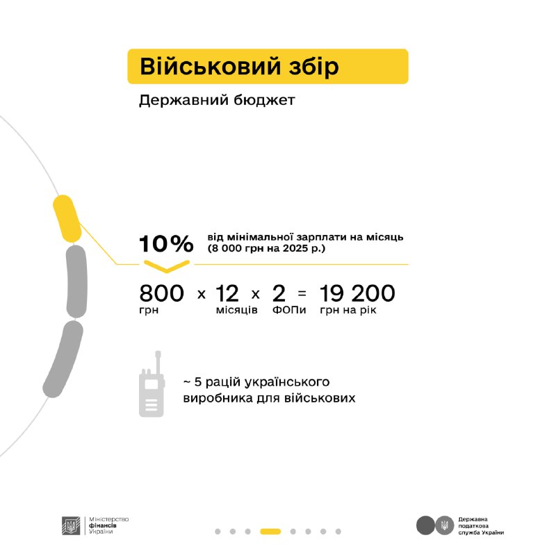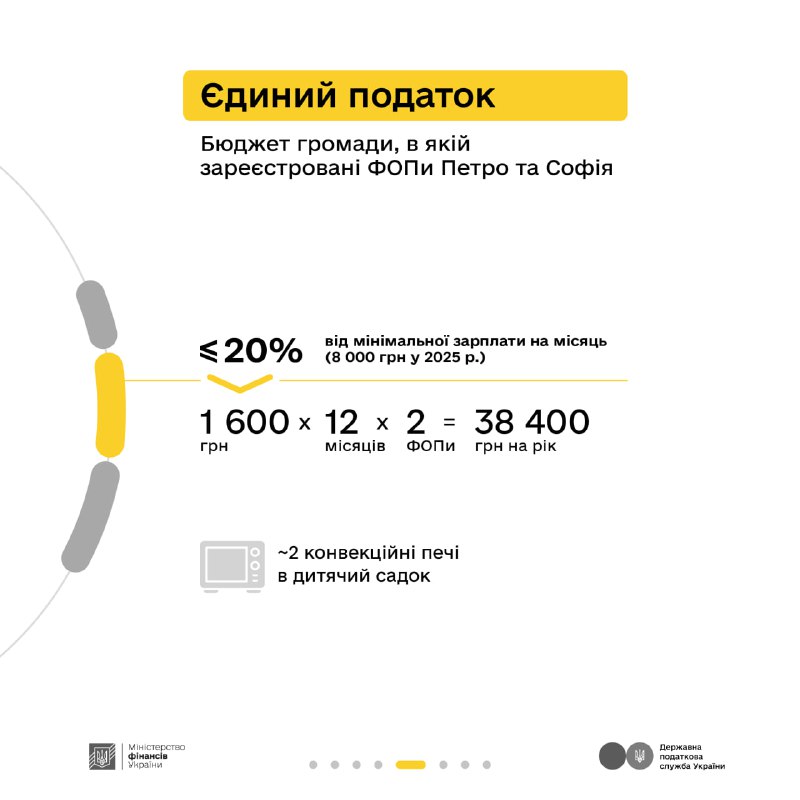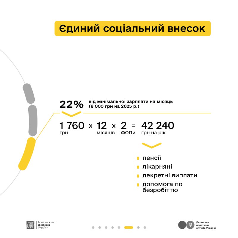 Підприємці щомісяця сплачують єдиний податок і військовий збір, а щокварталу — єдиний соціальний внесок. Звітність вони подають раз на рік через Електронний кабінет платника на сайті ДПС.
