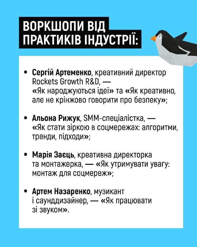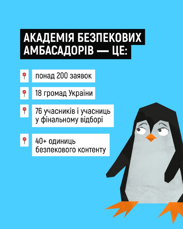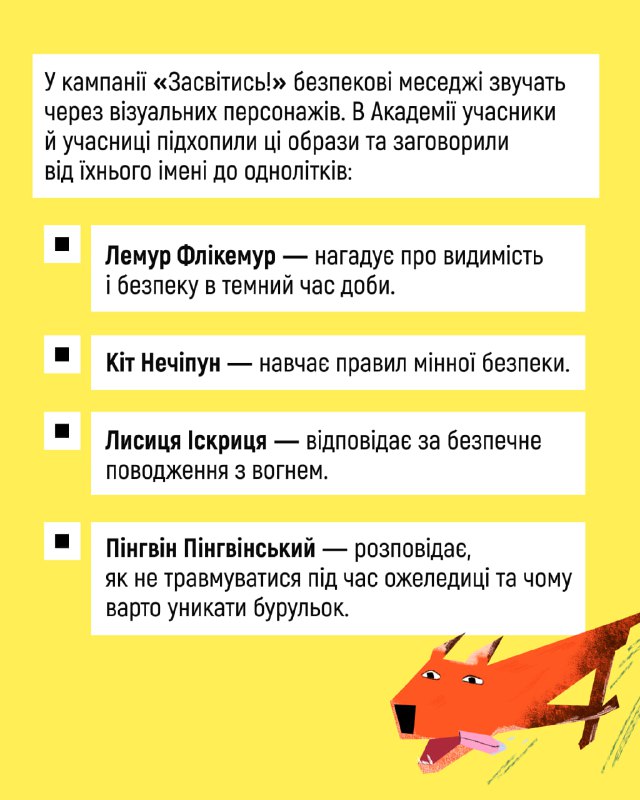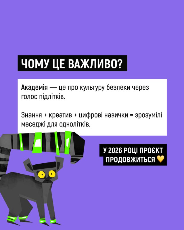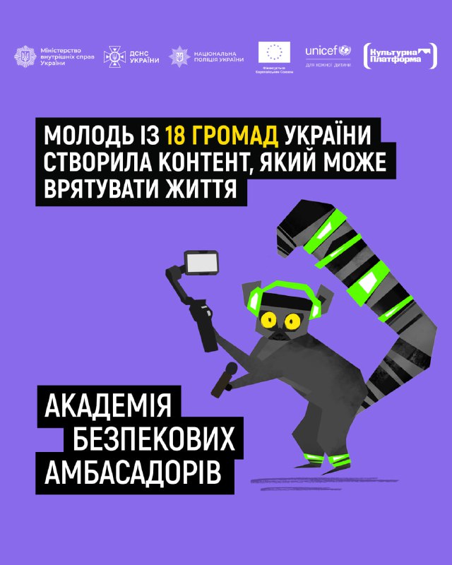 😍У січні 2026 року завершився фінальний етап Академії безпекових амбасадорів — безоплатної освітньо-креативної програми для підлітків 14–18 років 16.02.2026, Понеділок | 13:47 Автор допису: Державна служба з надзвичайних ситуацій 😍У січні 2026 року завершився фінальний етап Академії безпекових амбасадорів — безоплатної освітньо-креативної програми для підлітків 14–18 років. Завдяки цій ініціативі молодь із 18 регіонів України створила понад 40 одиниць безпекового контенту для однолітків. Переглянути роботи фіналістів і фіналісток можна за покликанням. А на картках у каруселі розповідаємо про шлях, який пройшли амбасадори й амбасадорки. Проєкт реалізувала Культурна платформа в партнерстві з МВС, ДСНС, НПУ та ЮНІСЕФ як частину інформаційно-просвітницької кампанії «Засвітись!». 🆘 Сайт • Fb • X • IG • YT • TT Джерело Друк / PDF