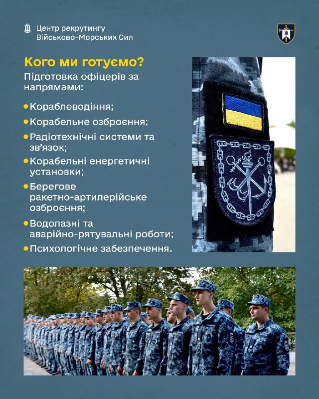 👨🎓 У нас готують фахівців у морській справі: навігація, озброєння, радіотехніка, енергетичні установки, пошуково-рятувальні роботи, психологічна підтримка та ін. Курсанти проходять комплексні випробування та отримують знання й навички для служби на флоті. Хочеш стати частиною національного флоту та служити Україні на морі? Обирай шлях офіцера — обирай ІВМС