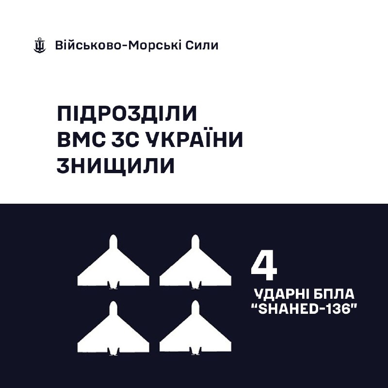 За минулу добу, станом на 06:00 25.02.2026, силами та засобами Військово-Морських Сил Збройних Сил України у складі угруповань було збито 4 ударні БпЛА типу «SHAHED-136».