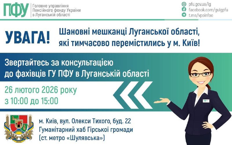 26 лютого у столичному хабі Гірської громади відбудеться прийом переселенців представником ГУ ПФУ в Луганській області.