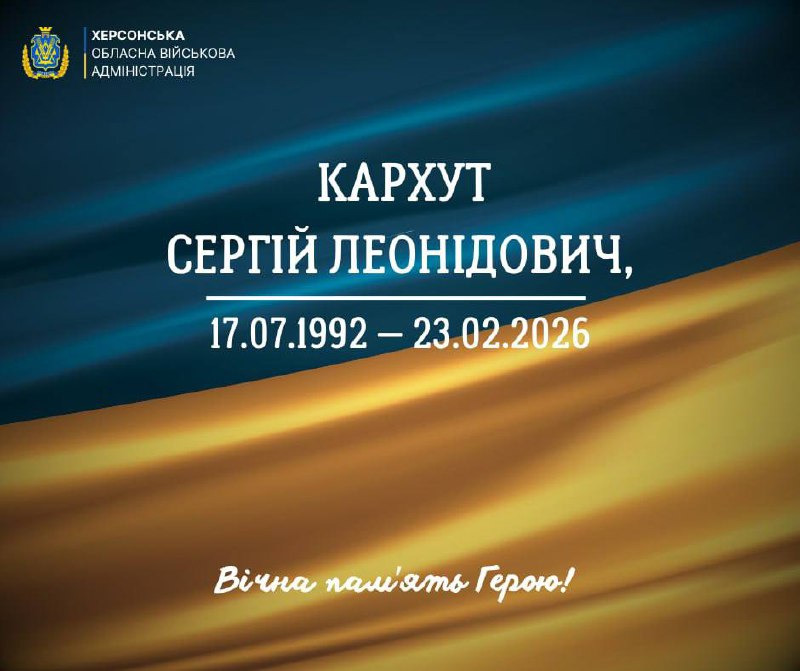 🕯9:00 – хвилина мовчання за усіма полеглими в російсько-українській війні. 27.02.2026, П’ятниця | 8:59 Автор допису: Херсонська обласна військова адміністрація 🕯9:00 – хвилина мовчання за усіма полеглими в російсько-українській війні. Херсонщина втратила мужнього Героя, який віддав своє життя за свободу та незалежність України. 33-річний курсант Сергій Кархут помер у госпіталі внаслідок ускладнення хвороби. Щирі співчуття рідним та близьким! Вічна памʼять Захиснику України! Памʼятаємо кожного та кожну, хто віддав життя за Батьківщину! Джерело Друк / PDF