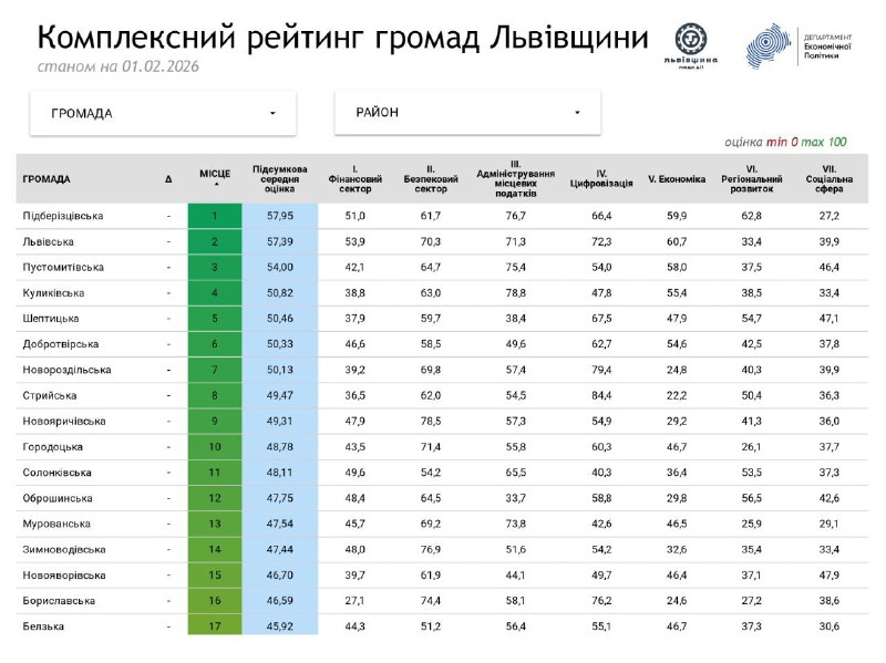 Оновили рейтинг територіальних громад Львівщини станом на 1 лютого 2026 року.