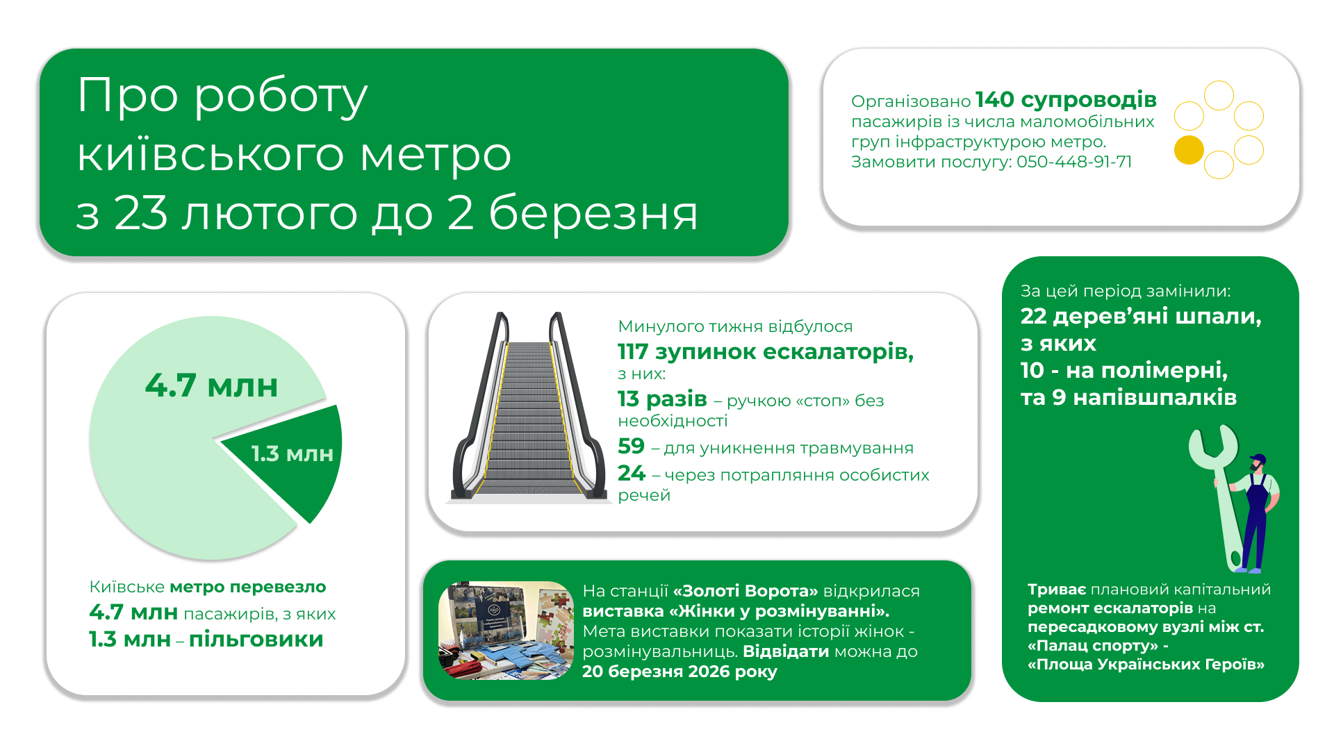 У цей період також фахівці організували 140 супроводів пасажирів із числа маломобільних груп інфраструктурою метрополітену. Нагадаємо, що для замовлення супроводу необхідно зателефонувати за номером (044) 238-55-11 або 050-448-91-71 та повідомити маршрут поїздки в метрополітені. У підприємстві рекомендують телефонувати за годину до запланованої поїздки, аби працівник метро очікував біля початкової станції.