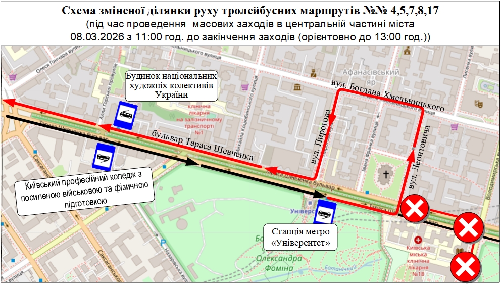У неділю, 8 березня, в центральній частині Києва тимчасово змінить рух наземний громадський транспорт. Це пов’язано з проведенням масових заходів у центрі столиці, інформують у КП «Київпастранс».