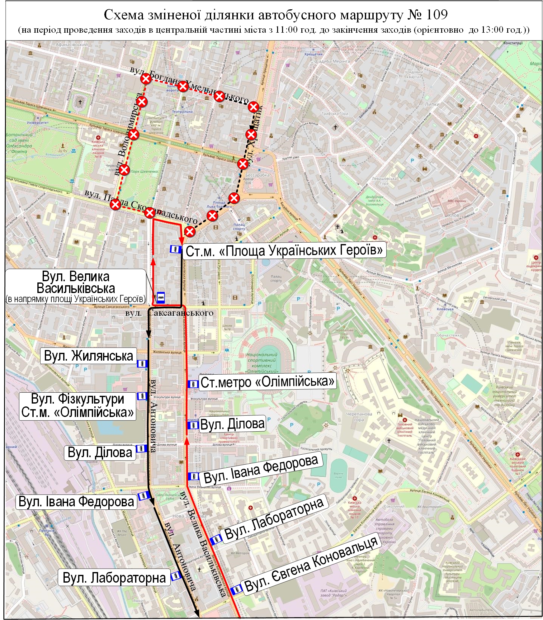 автобус № 109 – від ст. м. «Харківська» до вул. Антоновича за власним маршрутом, далі вул. Гетьмана Павла Скоропадського – площа Українських Героїв – вул. Велика Васильківська, далі за власним маршрутом до ст. м. «Харківська»;