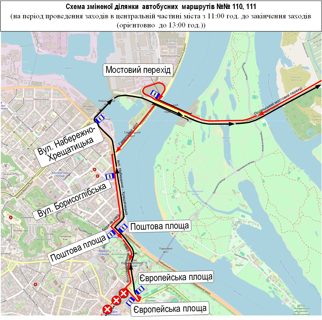 автобус № 114 – від вул. Милославської до вул. Хрещатик за власним маршрутом, далі Майдан Незалежності – вул. Михайлівська – вул. Велика Житомирська (у зворотному напрямку – Володимирський проїзд) – вул. Володимирська – вул. Богдана Хмельницького – вул. Пирогова (у зворотному напрямку – вул. Леонтовича) – бульв. Тараса Шевченка – вул. Симона Петлюри – залізничний вокзал «Центральний»;