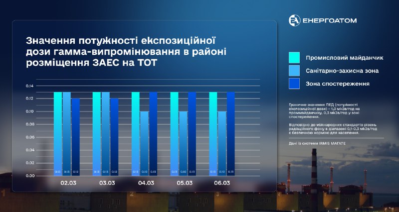 З 02 по 06 березня 2026 року потужність експозиційної дози гамма-випромінювання в районі розміщення Запорізької АЕС на тимчасово окупованих територіях України відповідала чинним нормам.