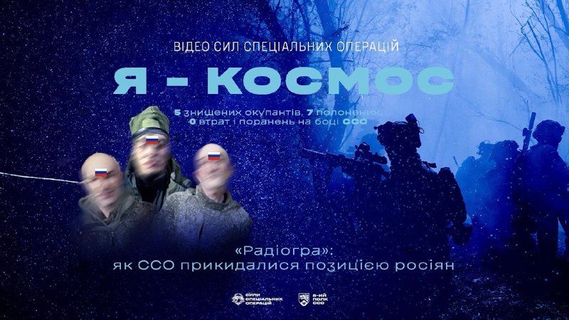 «Я – КОСМОС! «Радіогра»: як ССО прикидалися позицією росіян… У ході спеціальних дій на Донеччині оператори 8 полку Сил спеціальних операцій здійснили наліт на ворожу позицію «Космос» та взяли в полон військовослужбовців рф. Захопивши ворожу радіостанцію…