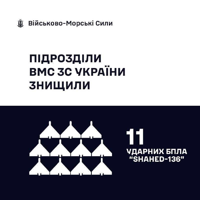За минулу добу, станом на 06:00 10.03.2026, силами та засобами Військово-Морських Сил Збройних Сил України у складі угруповань було збито 11 ударних БпЛА типу «SHAHED-136».
