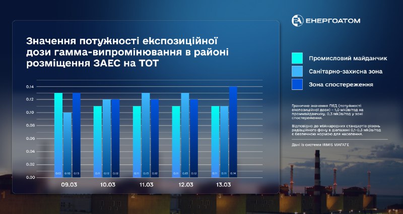 З 09 по 13 березня 2026 року потужність експозиційної дози гамма-випромінювання в районі розміщення Запорізької АЕС на тимчасово окупованих територіях України відповідала чинним нормам.