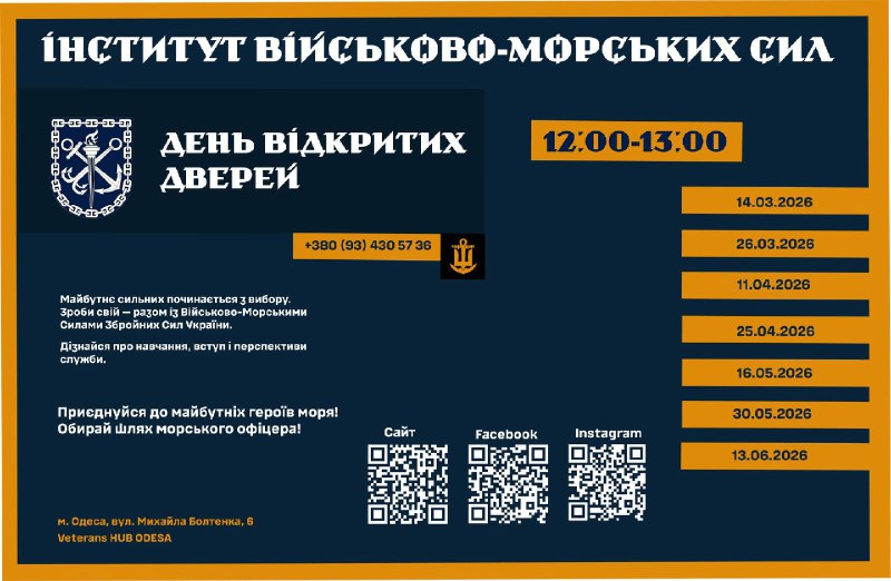 Україна – морська держава і їй потрібні професійні військові моряки. ЗРОБИ СВІЙ ВИБІР, ОБИРАЙ ШЛЯХ ОФІЦЕРА морського офіцера! 13.03.2026, П’ятниця | 8:35 Автор допису: Військово-Морські Сили Збройних Сил України Україна – морська держава і їй потрібні професійні військові моряки. ЗРОБИ СВІЙ ВИБІР, ОБИРАЙ ШЛЯХ ОФІЦЕРА морського офіцера! Інститут Військово-Морських Сил НУ "ОМА" Джерело Друк / PDF