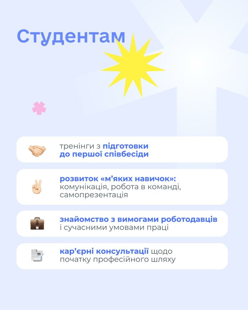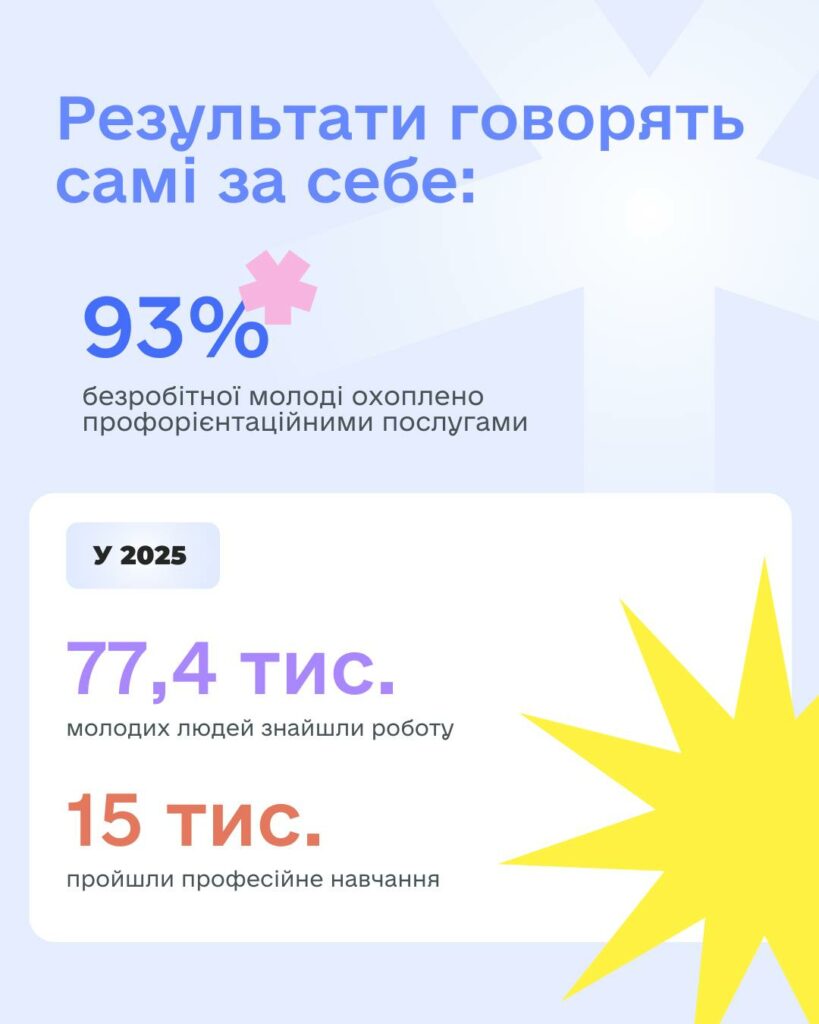 Служба зайнятості також активно працює зі студентською молоддю, допомагаючи підготуватися до першого працевлаштування. Для цього проводяться тренінги з розвитку «м’яких навичок», зокрема ефективної комунікації, командної роботи та самопрезентації під час співбесіди з роботодавцем. Окремі інформаційні семінари організовуються і для батьків, аби вони могли підтримати дітей у плануванні професійної кар’єри. Загалом упродовж 2025 року профорієнтаційними послугами служби зайнятості скористалися понад 125,6 тисячі молодих людей.