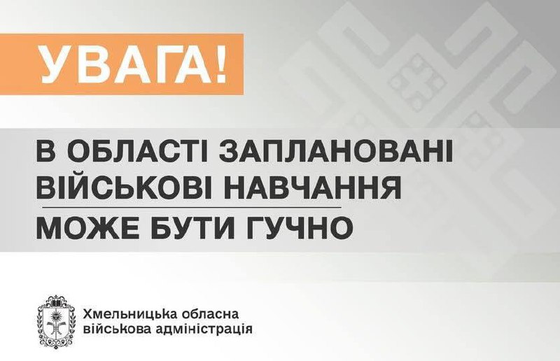 Сьогодні в межах Хмельницької громади заплановані військові навчання. Буде гучно з 09:00 до 15:00. 20.03.2026, П’ятниця | 9:49 Автор допису: Голова Хмельницької обласної військової адміністрації Сьогодні в межах Хмельницької громади заплановані військові навчання. Буде гучно з 09:00 до 15:00. Джерело Друк / PDF